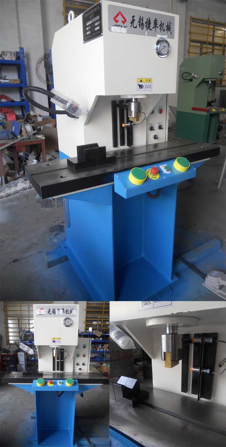 构压机则多用卧式。按结构型式分,液压机有双柱、四柱、八柱、焊接框架和多层钢带缠绕框架等型式,中、小型立式液压机还有用C型架式的。C型架式液压机三面敞开,操作方便,但刚性差。冲压用的焊接框架式液压机刚性好,前后敞开但左右封闭。在上传动的立式四柱自由锻造液压机中,油缸固定在上梁中,柱塞与活动横梁刚性连接,活动横梁由立柱导向,在工作液的压强作用下上下移动。横梁上有可以前后移动的工作台。在活动横梁下和工作台面上分别安装上砧和下砧。工作力由上、下横梁和立柱组成的框架承受。 采用泵-蓄能器驱动的大、中型的自由锻水压机常采用三个工作缸,以得到三级工作力。工作缸外还设有向上施加力的平衡缸和回程缸。